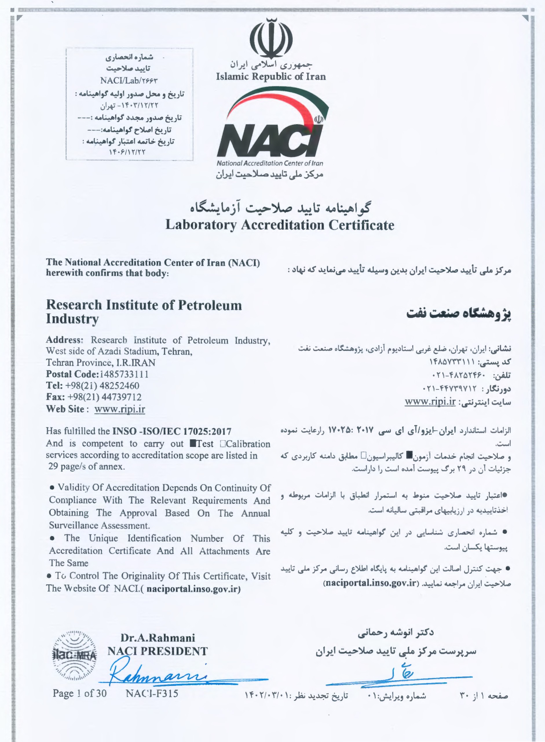 پژوهشگاه صنعت نفت، به‌عنوان یکی از نهادهای پیشرو در توسعه دانش‌های فناورانه و ارائه خدمات تخصصی در بخش‌های بالادستی، میان دستی و پایین دستی صنعت نفت و انرژی، موفق به دریافت گواهینامه تأیید صلاحیت آزمایشگاهی بر اساس استاندارد بین‌المللیINSO_ ISO/IEC 17025:2017 از مرکز ملی تأیید صلاحیت ایران (NACI) گردیده است.به گزارش روابط عمومی پژوهشگاه صنعت نفت، این گواهینامه که در نتیجه ارزیابی‌های دقیق، میدانی و مستند توسط ارزیابان NACI و در چارچوب الزامات استانداردهای بین‌المللی و ملی صادر شده است، تأییدی رسمی بر صلاحیت فنی، قابلیت اطمینان نتایج آزمون‌ها، کفایت تجهیزات، رعایت الزامات مدیریتی و تضمین کیفیت خدمات آزمایشگاهی در این پژوهشگاه است.جایگاه گواهینامه INSO_ISO/IEC 17025:2017 در نظام کیفیت جهانیاستاندارد INSO_ISO/IEC 17025، به‌عنوان مرجع بین‌المللی برای تأیید صلاحیت آزمایشگاه‌ها، بر ایجاد نظامی دقیق و مستند در فرآیند آزمون و کالیبراسیون تمرکز دارد. دارا بودن این گواهینامه به منزله‌ی اعتبار بخشیدن به نتایج آزمایشگاهی و پذیرش آن‌ها توسط مراجع ذی‌صلاح داخلی و بین‌المللی بوده و یکی از پیش‌نیازهای اصلی برای ارائه خدمات آزمایشگاهی در سطح استاندارد جهانی محسوب می‌شود.ارزیابی فنی و ساختاری پژوهشگاه صنعت نفتدر فرآیند ارزیابی صورت‌گرفته توسط مرکز ملی تأیید صلاحیت ایران، ابعاد مختلف عملکرد آزمایشگاه‌های پژوهشگاه شامل:نظام مدیریت کیفیت و مستندسازی فرآیندها؛ صلاحیت علمی و تجربی کارشناسان فنی؛ نحوه کنترل تجهیزات؛ کالیبراسیون و نگهداری؛ اعتبارسنجی روش‌های آزمون و اندازه‌گیری؛ قابلیت ردیابی نتایج و اطمینان از صحت داده‌ها؛ ارزیابی ریسک‌ها و مدیریت اصلاح و بهبود مستمر؛ به دقت مورد بررسی قرار گرفت و پژوهشگاه موفق به احراز کامل الزامات این استاندارد شد.دستاوردی حاصل از هم‌افزایی دانشی، مدیریتی و زیرساختیموفقیت در اخذ این گواهینامه، حاصل رویکرد نظام‌مند و یکپارچه در ارتقاء کیفیت، توسعه منابع انسانی متخصص، استقرار فرآیندهای بهبود مستمر و تجهیز آزمایشگاه‌ها به فناوری‌های نوین بوده است. همچنین پشتیبانی راهبردی مدیریت ارشد پژوهشگاه و تلاش بی‌وقفه کارشناسان حوزه‌های فنی و کیفیت، نقش کلیدی در نیل به این دستاورد داشته‌اند.چشم‌انداز آینده: توسعه همکاری‌های ملی و بین‌المللیبا اخذ این گواهینامه، پژوهشگاه صنعت نفت نه‌تنها گامی اساسی در افزایش اعتبار بین‌المللی خود به‌عنوان یک مرجع آزمون مورد تأیید برداشته است، بلکه زمینه را برای: گسترش تعامل با صنایع بالادستی و پایین‌دستی نفت و گاز؛ همکاری‌های فنی با نهادهای استانداردسازی و ارزیابی انطباق؛ توسعه خدمات آزمون‌های تخصصی برای پروژه‌های پژوهشی، صنعتی و صادراتی و مشارکت در تدوین و بومی‌سازی استانداردهای ملی فراهم آورده است.این موفقیت را می‌توان فرصتی در مسیر تثبیت جایگاه پژوهشگاه صنعت نفت به‌عنوان قطب علمی و فنی آزمایشگاهی کشور قلمداد کرد. این نهاد تخصصی، با بهره‌گیری از دانش روز، نیروی انسانی توانمند و زیرساخت‌های فناورانه، عزم راسخی در راستای ایفای نقش کلیدی در زیست بوم نوآوری صنعت نفت و تحقق اهداف کلان توسعه ملی دارد.