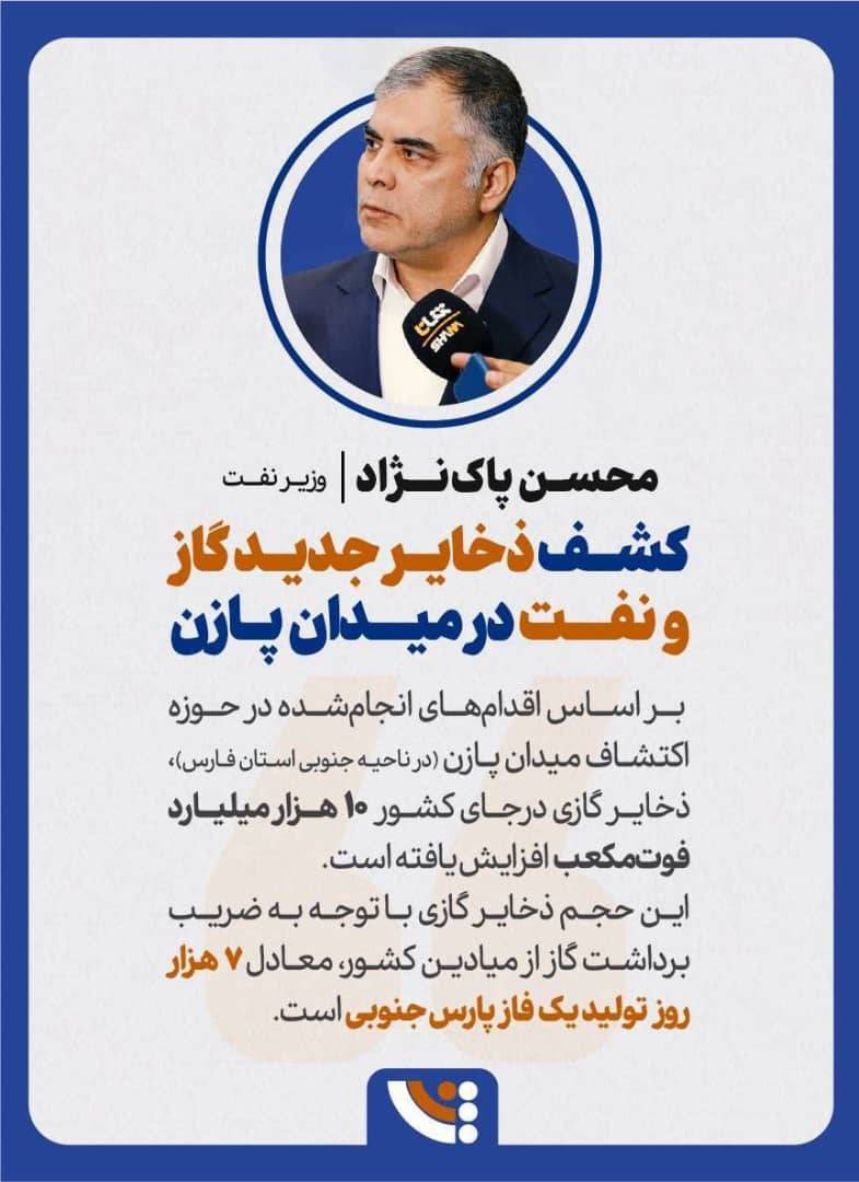 به گزارش روابط عمومی پژوهشگاه صنعت نفت به نقل از شبکه اطلاع رسانی نفت وانرژی «شانا»محسن پاک‌نژاد، وزیر نفت، از کشف ذخایر بزرگ گازی و نفتی میدان «پازن» در جنوب استان فارس خبر داد و افزود: